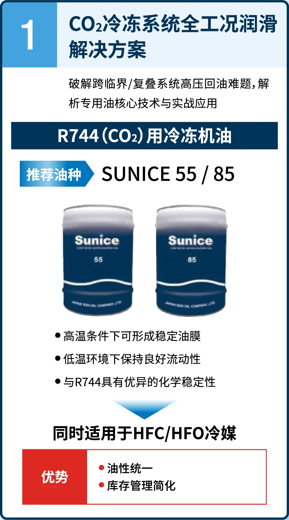 基于日本太阳石油研发的专利技术,具备与制冷剂不混溶的特性,有助于在满足系统运行要求的同时,优化成本结构和制冷剂配置,兼顾设备性能与环保考量。