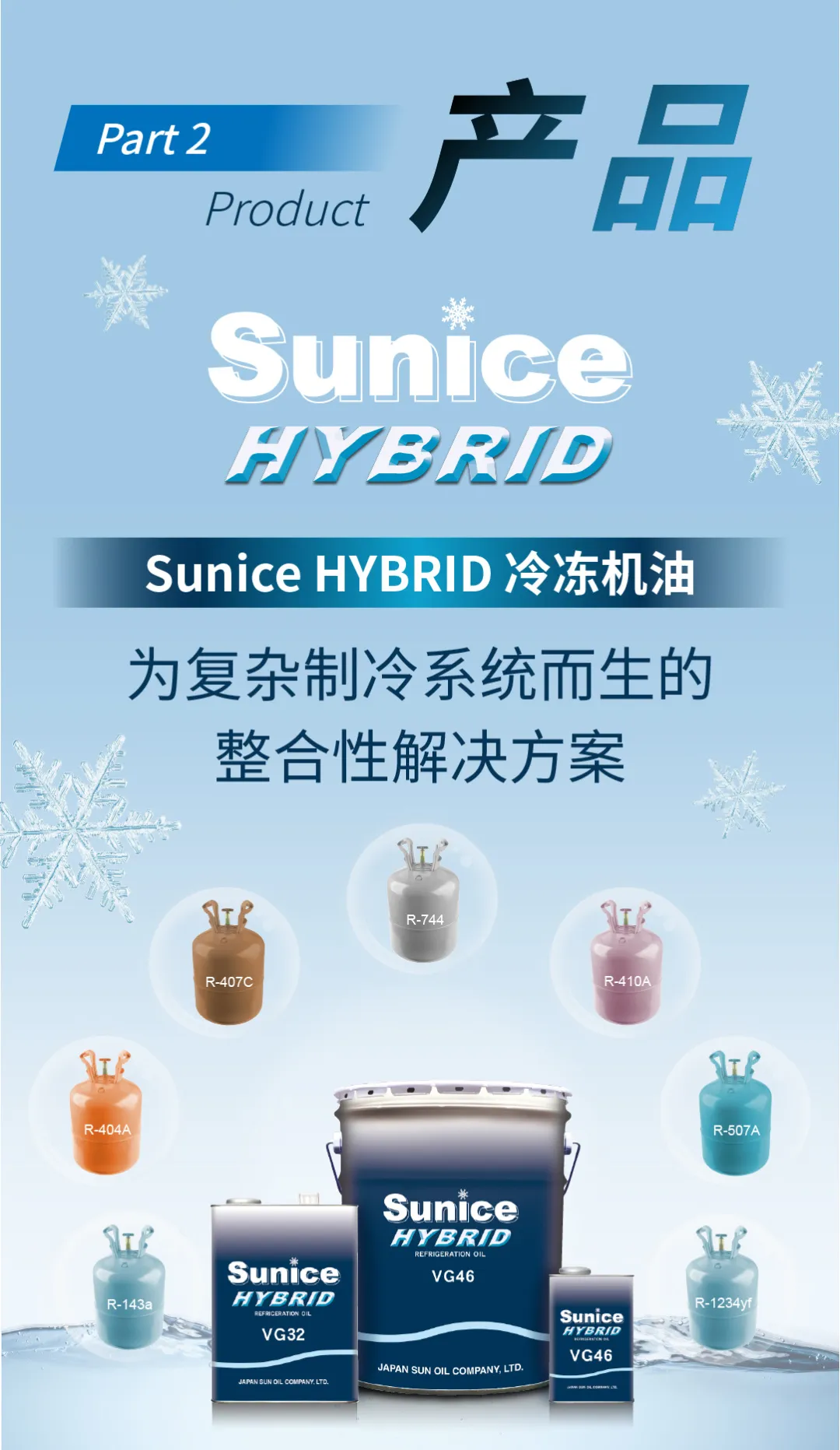 Sunice HYBRID 适用于使用 HFC、HFO、CO₂ 等主要制冷剂的各种系统,涵盖使用 POE、PAG、PVE 的压缩机。无论是冷藏船舶还是冷藏运输车辆,一油即可应对。