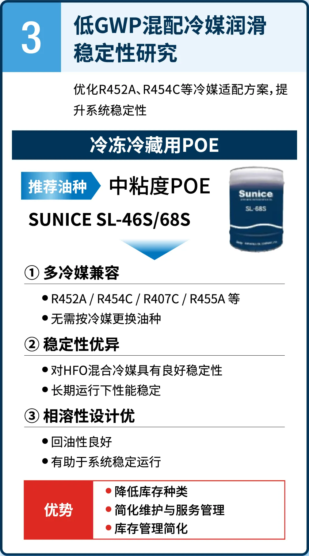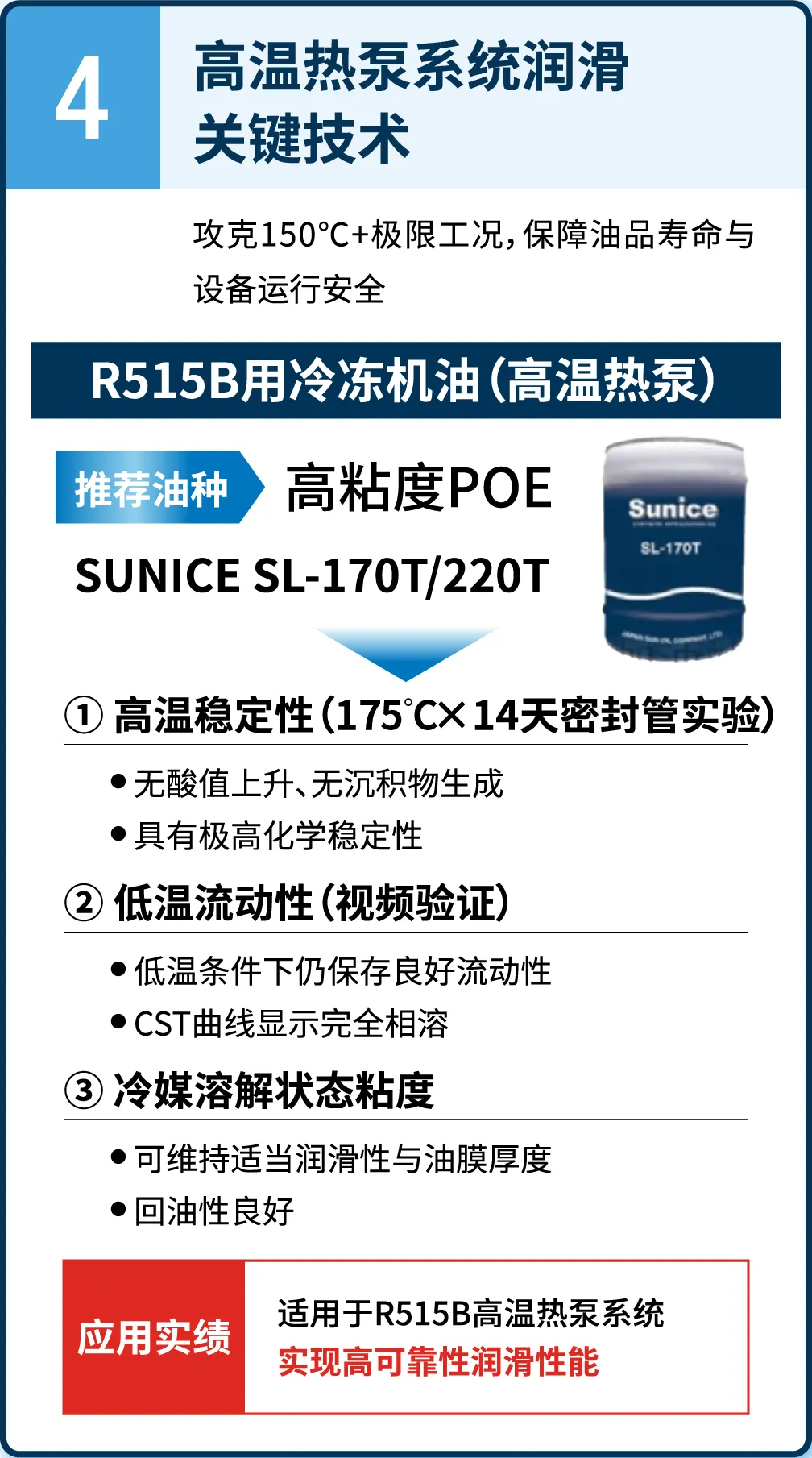 基于日本太阳石油研发的专利技术,具备与制冷剂不混溶的特性,有助于在满足系统运行要求的同时,优化成本结构和制冷剂配置,兼顾设备性能与环保考量。